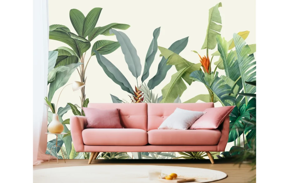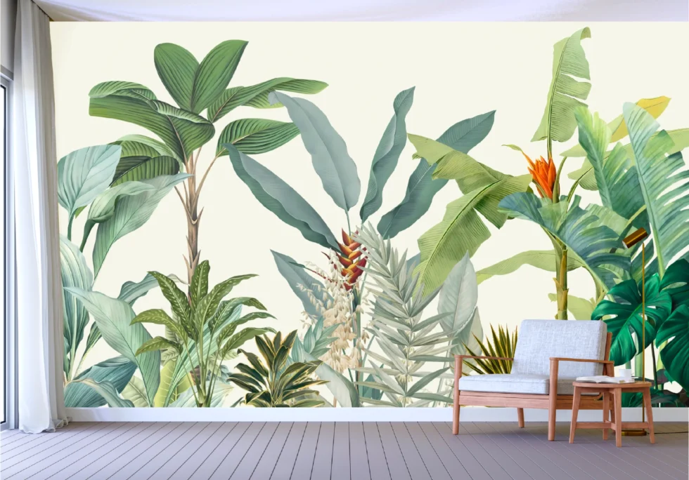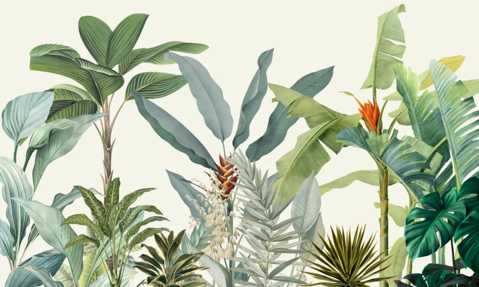 Immerse yourself in the serene elegance of Tropical Whispers, a wallpaper that brings the lush vibrance of the tropics into your space. This botanical composition features a stunning variety of palm leaves, banana plants, and exotic foliage in soft, muted greens with accents of golden yellow and burnt orange blooms. The light beige background allows the richly detailed leaves to pop without overwhelming the eye, creating a tranquil and modern jungle aesthetic. Perfect for living rooms, workspaces, or any area that craves a touch of calm, natural sophistication.