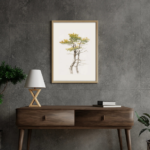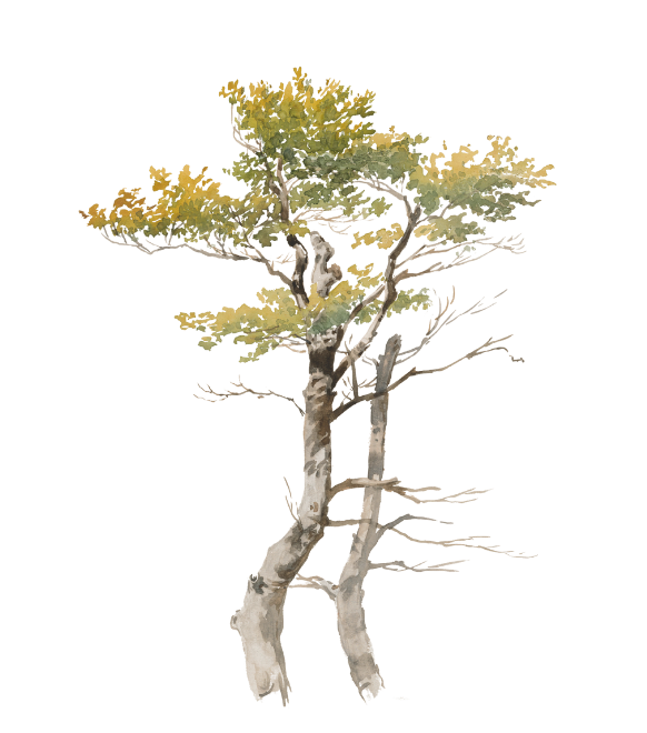 This artwork is a watercolor painting of a tree with a weathered, textured trunk and sparse yet graceful branches. The leaves, painted in soft shades of green and golden yellow, suggest the transition of seasons, adding warmth and depth to the composition. The loose, fluid brushstrokes capture the organic irregularity of nature while maintaining a sense of delicacy and lightness. The exposed branches contrast with the clusters of foliage, creating balance and movement. Set against a white background, the tree stands alone, evoking resilience, simplicity, and quiet beauty in its natural form.