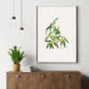 This artwork is a charming natural illustration featuring a robin among wild strawberries. The bird, with its warm orange breast and soft gray-brown wings, perches gracefully on a stem, gazing upward toward ripe red berries. Surrounding it are lush green leaves and delicate stems, intricately detailed to capture their natural texture. At the base, roots, berries, and speckled eggs add richness and narrative to the composition. The artist combines lifelike accuracy with artistic elegance, evoking a sense of harmony between wildlife and nature. Set against a white background, the piece highlights the robin’s vibrant presence within its fruitful environment.