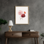 This artwork is a botanical illustration of three dahlias in bloom, showcasing their rich variety and elegance. The largest flower, in soft pastel pink, displays layered petals with delicate shading, while the deep red dahlia radiates boldness and vibrancy, accented by a golden-yellow center. A smaller, fiery orange-red bloom adds contrast and balance to the composition. The slender stems and subtle leaves frame the flowers gracefully without detracting from their brilliance. With fine detail and naturalistic texture, the illustration captures both the diversity and beauty of dahlias, blending scientific accuracy with refined artistic expression against a clean white background.