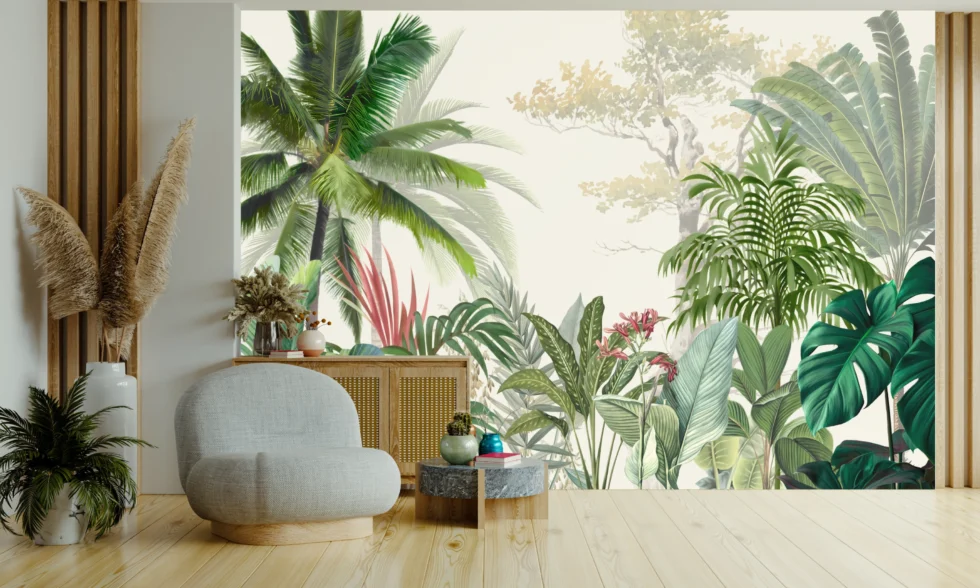 Step into a secluded jungle haven with Enchanted Rainforest, a wallpaper that captures the verdant beauty of the tropics. Towering palms, gracefully arching leaves, and lush undergrowth come together in a rich tableau of greens and subtle hints of color. The layered foliage creates a soothing depth, while the neutral backdrop highlights each plant’s delicate textures. Ideal for adding a touch of exotic tranquility, Enchanted Rainforest transforms any room into a peaceful sanctuary reminiscent of a hidden tropical retreat.