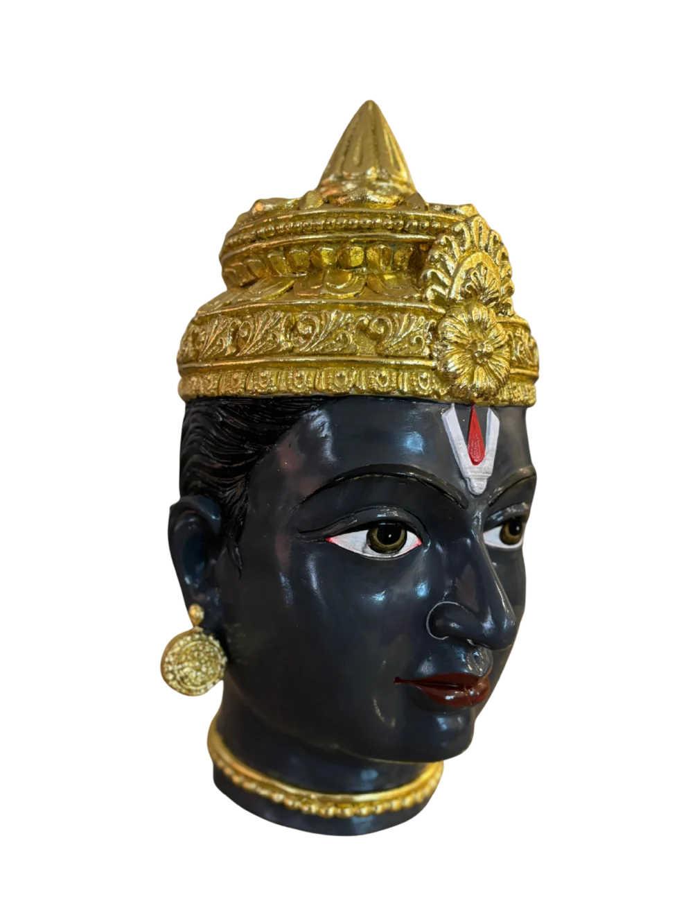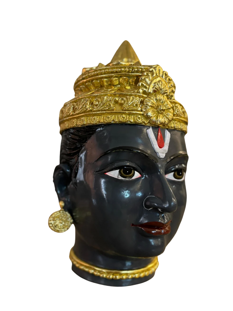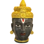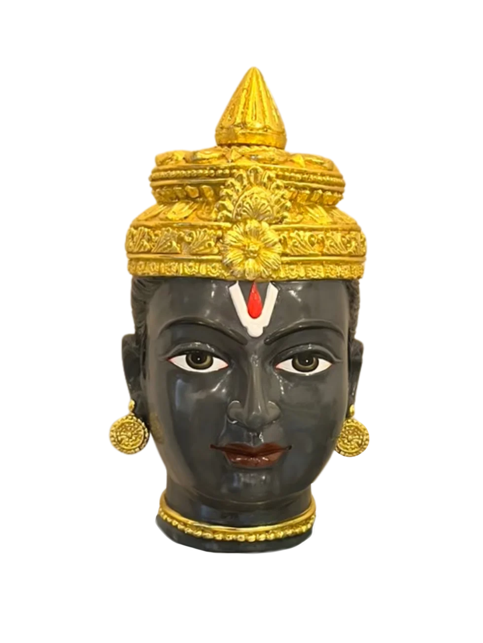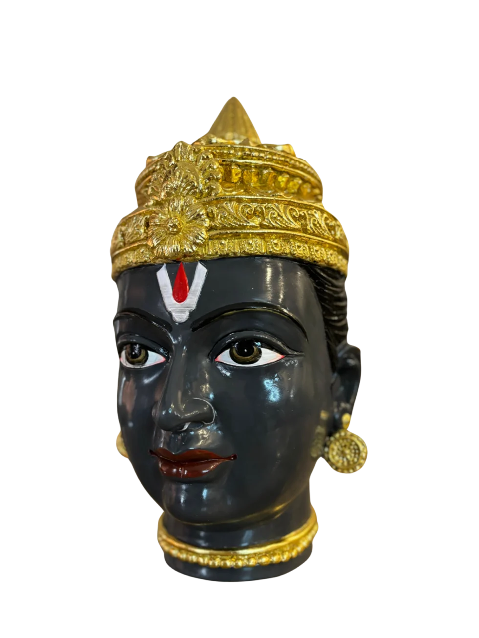 This handcrafted face sculpture reflects timeless elegance and divine artistry. The deep black finish is beautifully contrasted with an ornate golden crown, detailed earrings, and a choker necklace. The expressive eyes, tilak, and serene smile give the piece a sacred and lifelike presence, making it a striking centerpiece for spiritual spaces or home décor