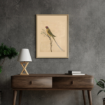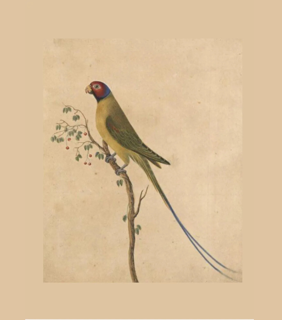 This artwork portrays a striking parrot perched delicately on a slender branch. The bird is painted in earthy greens and yellows, with a vibrant red and blue face that adds a bold accent. Its long, graceful tail feathers extend dramatically, emphasizing elegance and balance. The branch it rests on holds small leaves and berries, enhancing the naturalistic charm of the composition. The muted beige background lends the piece an antique, timeless feel, drawing focus entirely to the bird’s vivid colors and intricate details. A harmonious blend of simplicity and sophistication, it celebrates the beauty of avian life.
