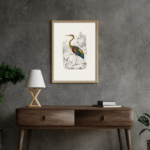 This artwork is a striking illustration of a heron standing gracefully by a wetland. The bird’s elongated neck and slender legs are elegantly portrayed, while its plumage bursts with vivid hues of deep blue, golden yellow, and rich red. The detailed feather patterns contrast beautifully against the softer, monochrome sketch of the surrounding reeds, water, and trees in the background. This combination of color and linework emphasizes the heron as the focal point while maintaining a natural setting. The piece blends scientific accuracy with artistic flair, capturing both the majesty of the bird and the tranquility of its habitat.