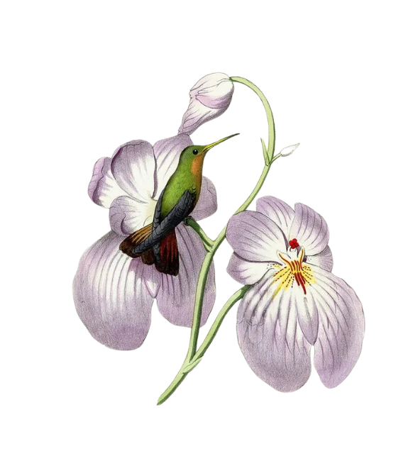 This artwork is a delicate illustration of a hummingbird perched on an orchid. The bird, with shimmering green feathers, an orange throat, and dark wings, contrasts vividly against the soft lilac petals of the orchid. The flowers, detailed with gentle folds and intricate markings of yellow and red, add elegance and depth to the composition. The slender stem curves gracefully, framing both bird and blossoms in harmony. The fine shading and lifelike detailing highlight the fragility of the orchid and the vibrancy of the hummingbird. Set against a clean white background, the piece captures the beauty of nature with refined artistry.