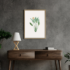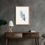 This artwork is a delicate botanical illustration of a blue hyacinth. The artist captures the flower’s soft, clustered petals in gentle gradients of blue, creating a lifelike yet graceful appearance. The vertical stem, with its elongated green leaf, provides balance and contrast to the intricate blossoms. Each bloom is carefully detailed, highlighting the natural symmetry and elegance of the hyacinth. The overall style is refined, blending scientific accuracy with artistic beauty, making it both educational and decorative. Its clean white background emphasizes the flower’s freshness and simplicity, allowing the hyacinth to stand out as the central focus.
