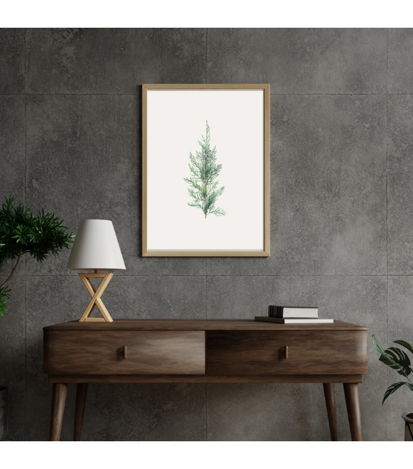 This artwork is a finely detailed botanical illustration of a cypress branch. The slender stem extends upward, adorned with delicate, feathery green foliage that spreads in soft layers. Tiny bluish cones are nestled among the leaves, adding texture and contrast to the airy greenery. The artist captures the plant’s natural elegance with subtle shading and meticulous linework, emphasizing both structure and lightness. Set against a white background, the illustration highlights the cypress’s graceful form, blending scientific precision with artistic refinement. It evokes a sense of calm and timeless beauty, showcasing nature’s quiet sophistication.