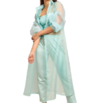 Featuring a light blue organza jacket paired with light blue off shoulder corset top and pants in cotton base.