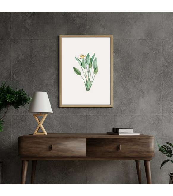 This artwork is a refined botanical illustration of the Bird of Paradise plant. The tall, slender stems rise gracefully, crowned with elongated, textured green leaves that fan out in natural symmetry. At the top, the iconic flower blooms with vibrant orange and blue hues, resembling a bird in flight. The artist’s meticulous detailing captures both the structural elegance of the leaves and the striking beauty of the blossom. With its clean white background, the composition emphasizes the plant’s exotic form, blending scientific precision with artistic finesse, making it both a decorative and educational piece.
