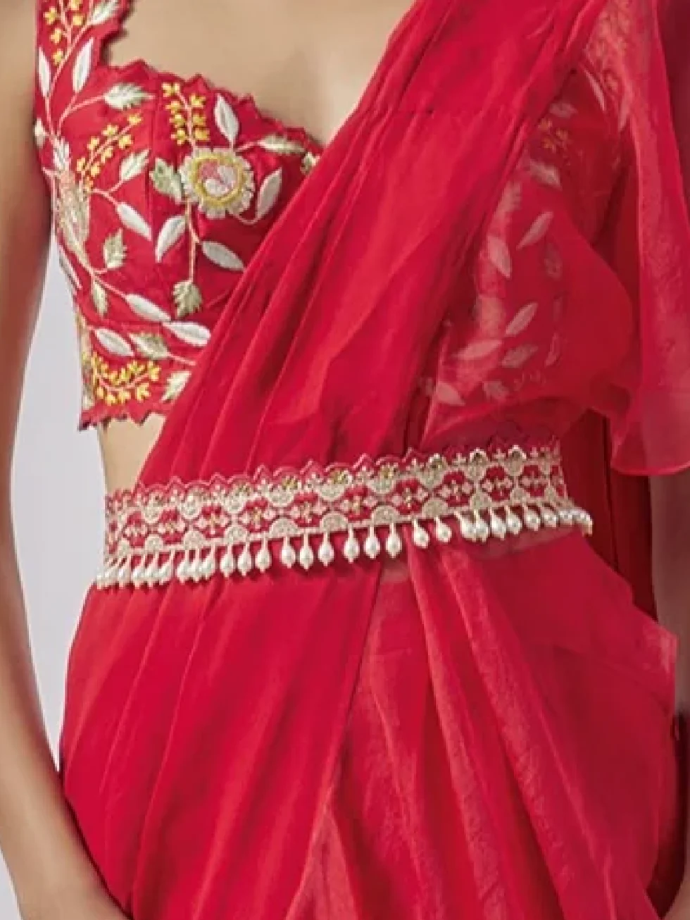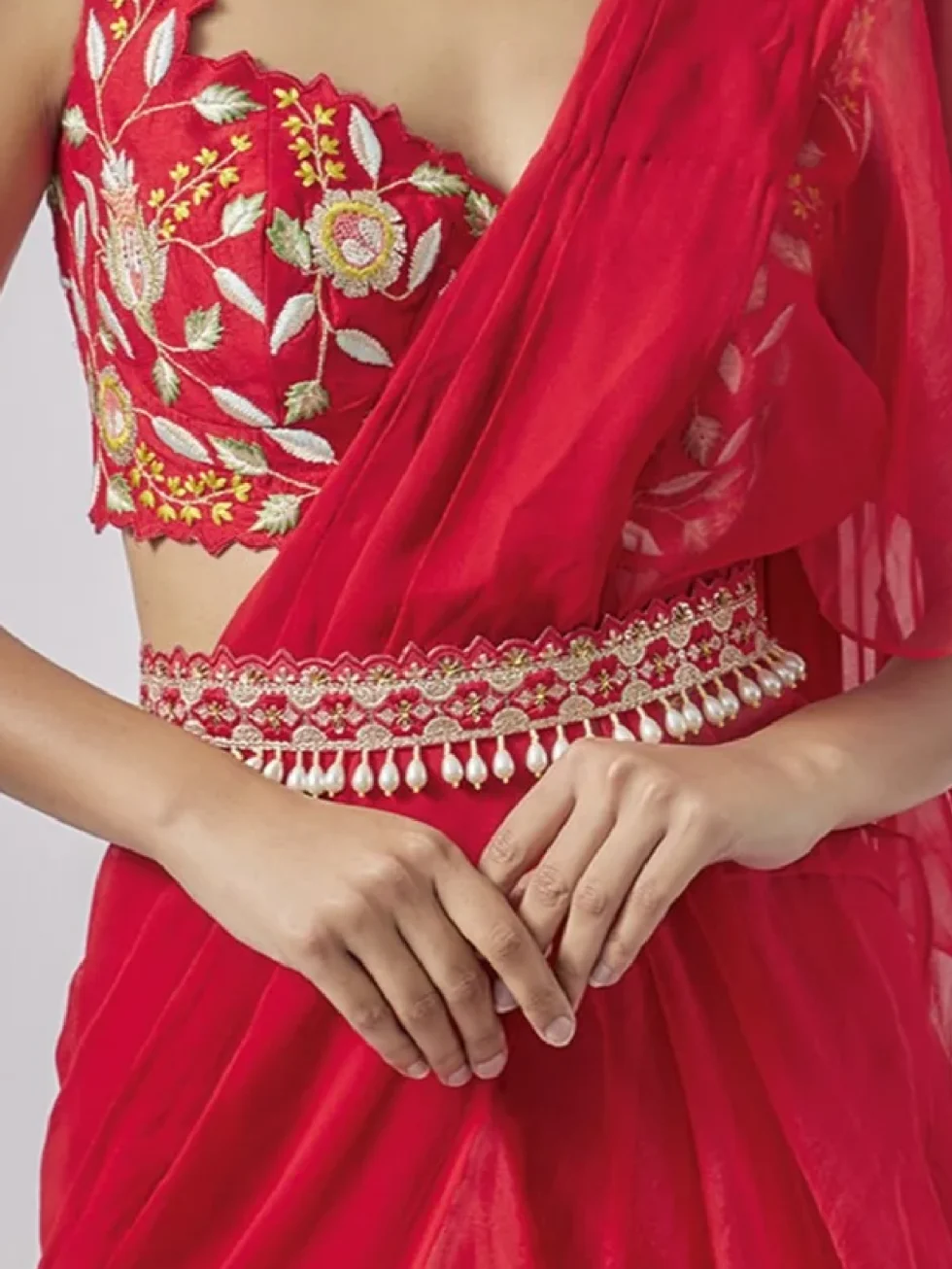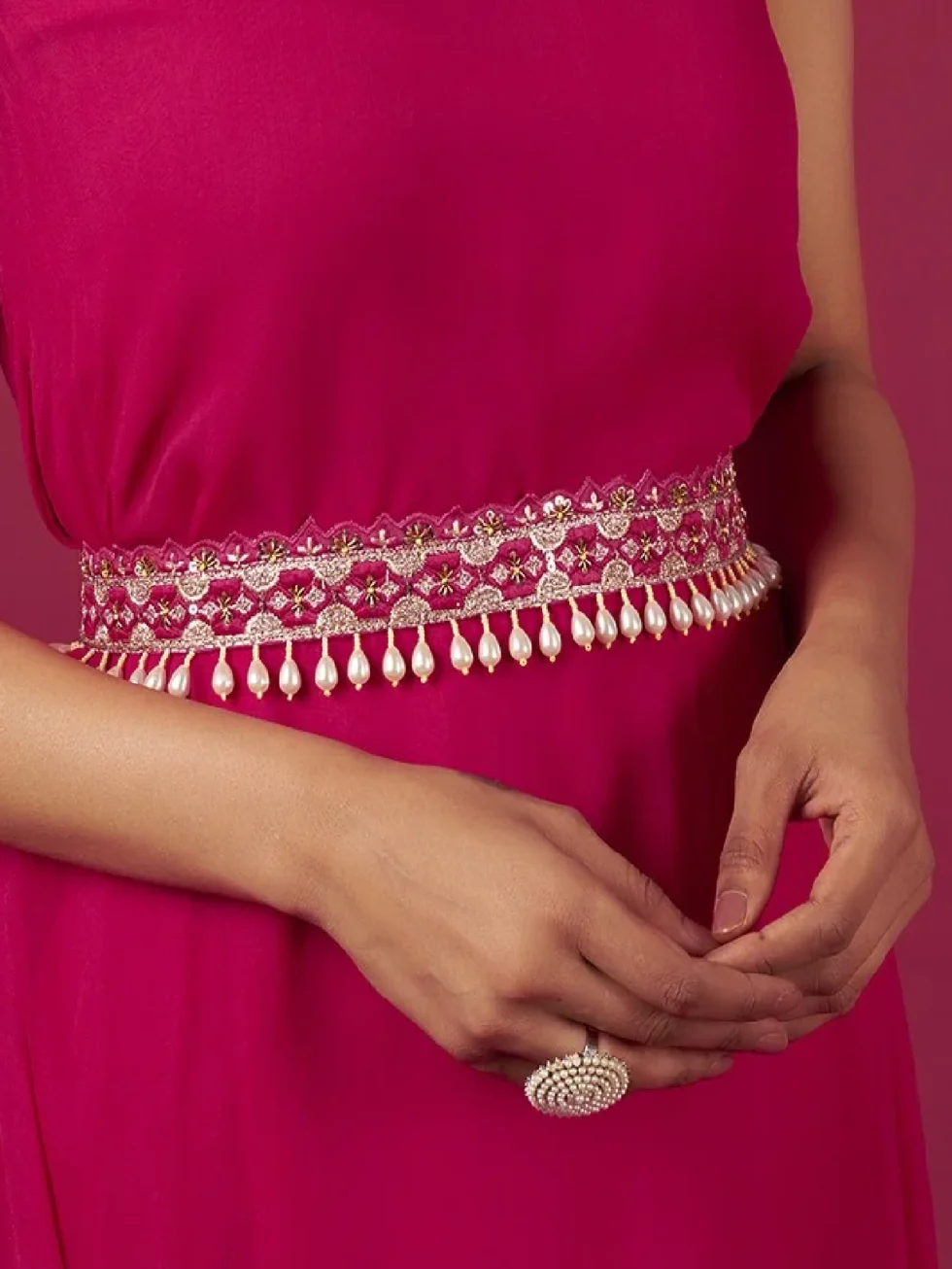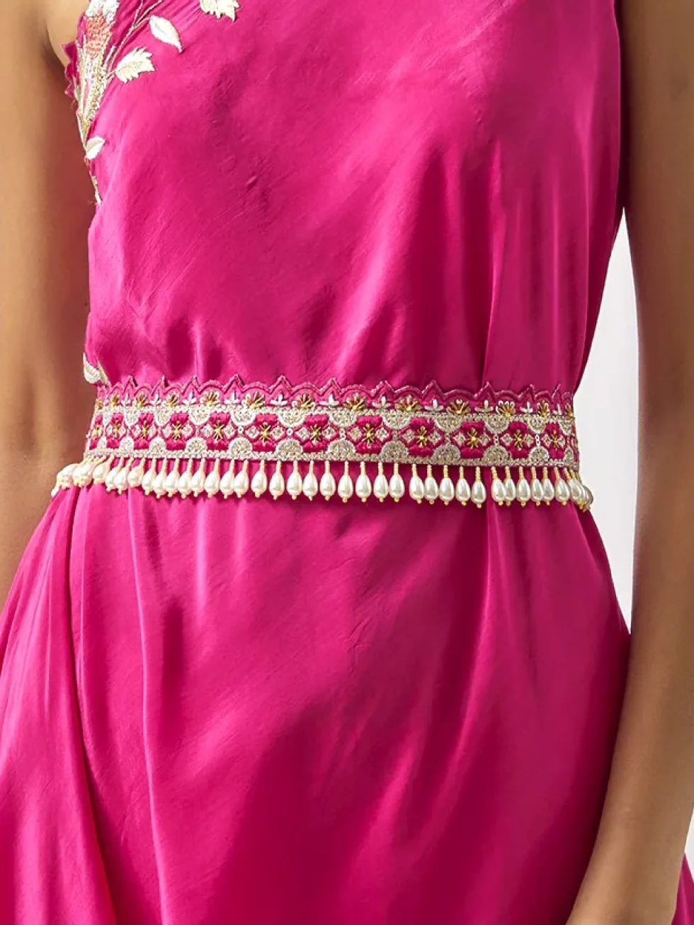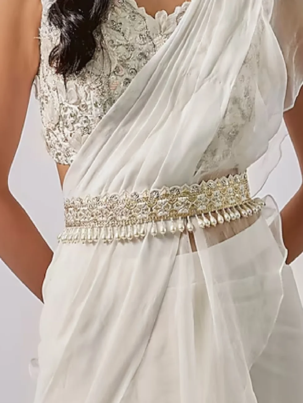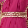 Add a touch of royal sophistication to your look with this stunning embroidered waist belt. It features intricate zari and sequin embroidery in gold and rose tones. The design is finished with an elegant border of dangling pearl drops that add graceful movement and timeless charm. Perfect for pairing with sarees, draped gowns, or lehengas, this belt beautifully defines the waist while elevating any festive or formal outfit.