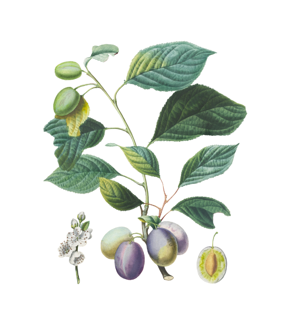 This artwork is a botanical illustration of a plum branch, capturing the plant’s fruiting and flowering stages. The branch bears lush, veined green leaves alongside clusters of ripe plums in shades of purple and green, their smooth surfaces detailed with subtle shading. At the side, a delicate blossom and a cross-section of the fruit reveal the stone within, emphasizing the plant’s anatomy. The composition balances scientific precision with artistic elegance, showcasing both the vitality of the foliage and the ripeness of the fruit. Set against a clean white background, the piece highlights the natural beauty and abundance of the plum.