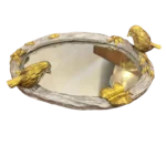 This handcrafted oval mirror tray brings nature’s charm into your home with its detailed sculpted frame. Designed to resemble textured wood in a silver finish, it is adorned with golden birds, butterflies, and floral accents that add elegance and warmth. Perfect as a decorative centerpiece or vanity tray this versatile piece enhances both modern and traditional interiors.