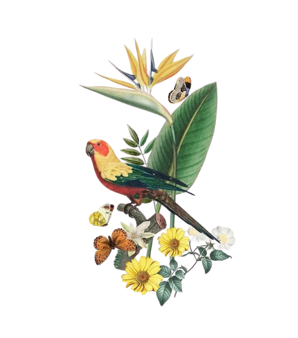 This artwork is a vibrant illustration of a parrot perched amidst a lush arrangement of tropical flora and butterflies. The parrot, with striking red, yellow, and green plumage, is the focal point, exuding vivid energy. Surrounding it are bright yellow daisies, white blossoms, and a bold bird of paradise flower with its iconic orange and blue petals. Butterflies in shades of orange, yellow, and black flit gracefully around, adding liveliness to the scene. The lush green leaves frame the composition beautifully. Set against a clean white background, the piece highlights the tropical harmony of color, life, and natural beauty.