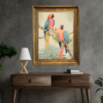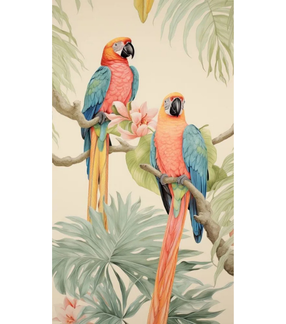 This artwork beautifully illustrates two vibrant parrots perched on tropical branches. Their feathers glow in bold shades of orange, red, blue, and green, creating a stunning contrast against the soft pastel background. Surrounded by lush tropical leaves and delicate pink flowers, the scene evokes the richness of a rainforest. The parrots’ long, colorful tails add elegance, while their attentive gazes capture a sense of life and interaction. The detailed rendering of feathers and foliage blends realism with artistic flair, celebrating the beauty of exotic wildlife in its natural habitat. A vivid, harmonious depiction of nature’s brilliance.