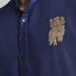 Perfectly suited for kurtas, bandis, or bandhgalas, it adds a rich statement to both festive and formal wear. Hand-stitched on a navy base, the brooch pairs beautifully with jewel tones and classic Indian silhouettes.