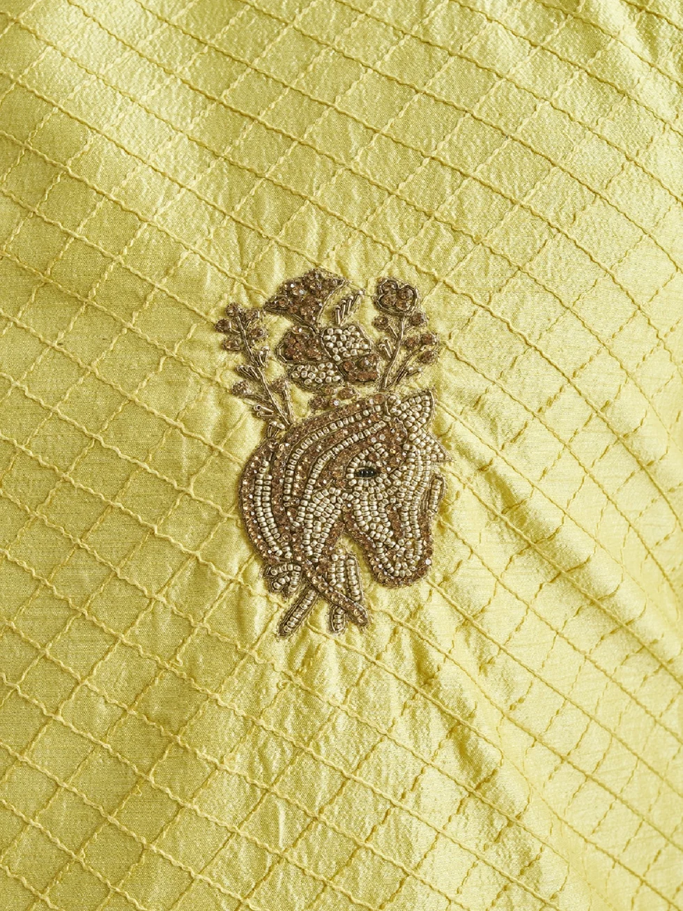 featuring our meticulously handcrafted Regal Stallion Brooch, designed for the modern man who appreciates heritage and craftsmanship. Intricately embroidered with antique gold beads and threadwork, this brooch features a majestic horse head adorned with delicate floral accents—symbolizing strength, grace, and timeless elegance.