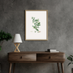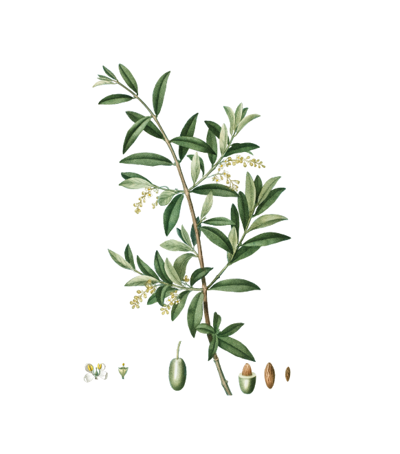 This artwork is a botanical illustration of an olive branch. The slender stem carries clusters of elongated green leaves, arranged neatly in pairs, alongside delicate yellow-white blossoms. At the base, detailed renderings of the olive fruit’s stages—from flower to fruit, seed, and kernel—highlight the plant’s life cycle. The artist’s precise lines and subtle shading bring out the texture of both leaves and fruit, combining scientific accuracy with artistic elegance. Set against a white background, the illustration emphasizes clarity and balance, celebrating the olive as both a cultural symbol and a natural marvel.