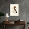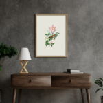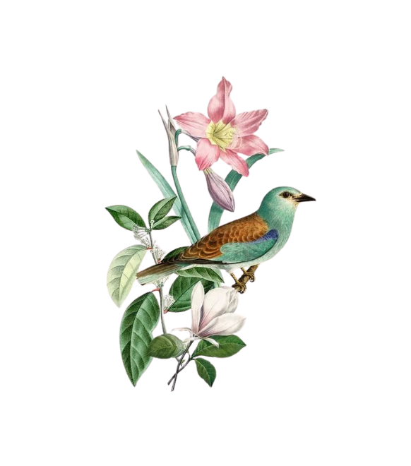 This artwork is a delicate illustration of a bird perched among vibrant flowers and lush foliage. The bird, with turquoise feathers, a golden-brown back, and hints of violet on its wings, radiates elegance and calm. Surrounding it are blooming flowers—a striking pink blossom and a gentle white bloom—accentuated by lush green leaves and soft buds. The fine detailing of feathers, petals, and leaves creates a harmonious interplay between bird and flora. Set against a clean white background, the piece emphasizes natural beauty and grace, blending realism with artistic charm in a serene and captivating composition.