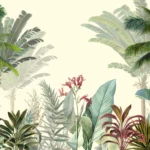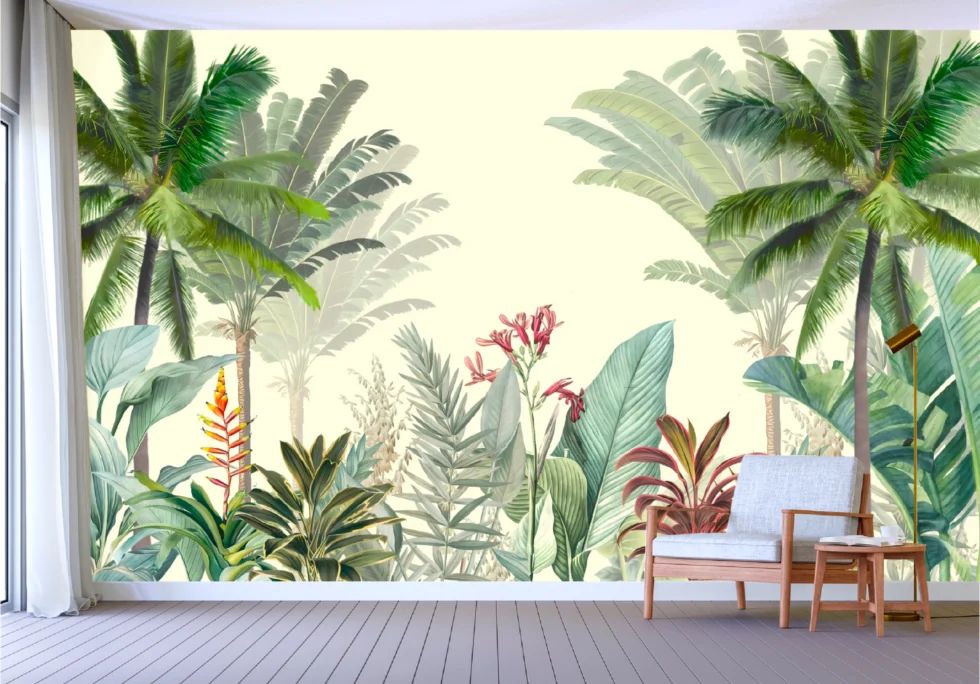 Transform your space into a sun-kissed getaway with Tropical flourish, a captivating wallpaper design showcasing a canopy of graceful palm trees and vibrant jungle foliage. Layers of feathery fronds and colorful tropical plants overlap in soft, organic waves, creating a sense of gentle movement and depth. The neutral background balances the lush greenery and bright pops of color, making it ideal for both contemporary and eclectic interiors. Perfect for bringing the calming rhythms of nature indoors, Tropical flourish offers an instant escape to a peaceful, paradisiacal haven.