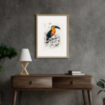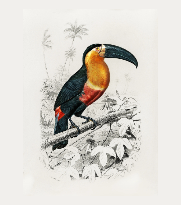 This artwork is a vivid illustration of a toucan perched on a branch. The bird’s bold features are highlighted by its massive black beak, contrasted with the golden-yellow chest, fiery orange-red belly, and deep black wings and tail. The lush tropical setting in the background is rendered in soft monochrome, allowing the toucan’s vibrant colors to stand out dramatically. The delicate linework of palm trees and foliage adds context without overshadowing the subject. The composition blends scientific precision with artistic vibrancy, celebrating the toucan’s exotic beauty and striking presence within its natural rainforest habitat.